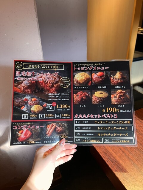 ハンバーグは黒毛和牛のA5で甘みもありつつしっかり食べ応えもありとても美味しい。
