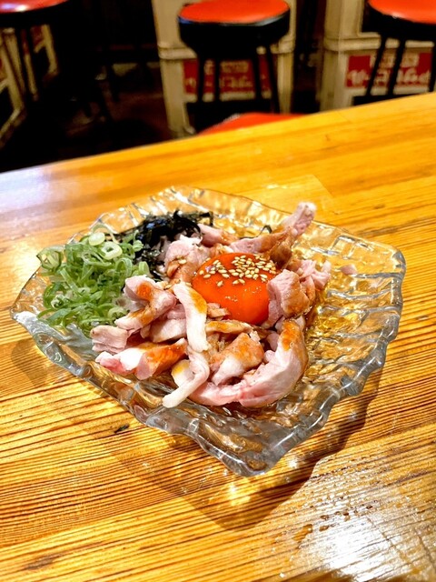 レアロース豚ハムユッケは、低温調理されたしっとりとした豚ロースに卵黄を絡めて楽しむ濃厚な味わい。重たすぎず、お酒のつまみにぴったり。