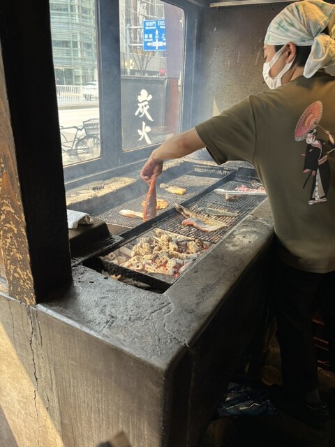 古民家風のお店。魚を炭火焼きしてくれている。一階はカウンター席中心。2名ということもあったのか、2階に案内された。2階は半個室のテーブル席が多数。