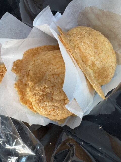 このお店は、「24時間で最も多く販売された焼きたてメロンパンの数」でギネス世界記録に挑戦し、2024年に世界記録として認定されたことで非常に有名です(記録:9,113個)。添付はノーマルメロンパンです。ギネスのメロンパンはシュークリームをイメージできる感じかな。