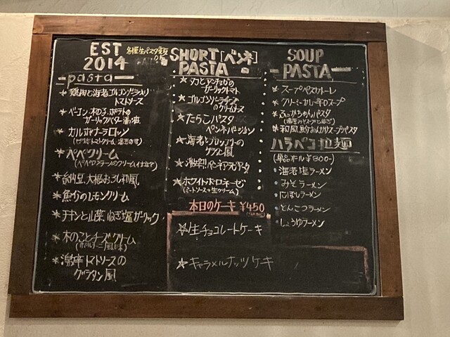パスタはメニューが豊富で更に黒板にもあって、選ぶのも楽しいです。クリーム系とグラタンの辛いパスタ2種類を食べました。結構辛くてはまりそうです。