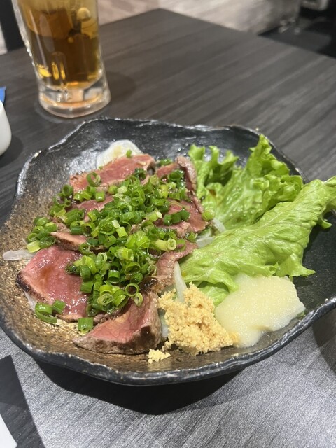 牛肉のタタキは噛めば牛肉に包み込まれるような甘みとニンニクの程よい辛さがマッチしていてお酒がとっても進みます´-