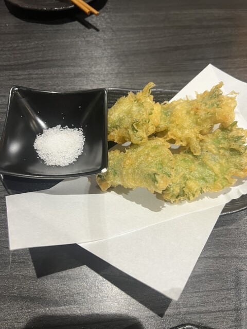 鯛の天ぷらです。味付けは塩のみとシンプルですが中に梅塩が練り込まれていてとても奥深い味わいになっています。