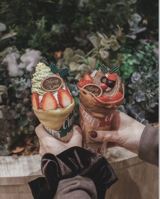 期間限定で出てるクリスマスクレープ✨いちごピスタチオは濃厚ピスタチオクリームカスタードベリージュレを合わせたクレープ見た目がツリーみたいで可愛く、モチモチのクレープがたまらない☺︎ブッシュドノエルはチョコレートクリームで、ガトーショコラとヌガーが入っているそう☺︎一緒に並べるて撮ると可愛さ増しまし〜♡*.゚安定の美味しさのクレープは、毎回、包装紙?も味によってデザインが違って見た目絵のこだわりも感じるおいしかった〜(⸝⸝⸝´༥`⸝⸝⸝)✿いちごピスタチオ ブッシュドノエル 各1320円