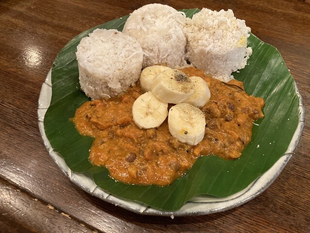 コースのバナナがカレーに乗ったプットゥ?蒸したヒエ+ココナッツが供されたものにしました。