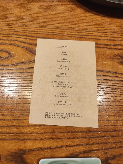 夕食のコース料理は、素材を活かしたシンプルな味付けでした。私は、飲食店はコンセプトがしっかりしている必要があると思っています。なので、それで正解なんじゃないかと。離島で、凝ったソースでシッカリ味付けしたご馳走は、ちょっと違和感がありますね。