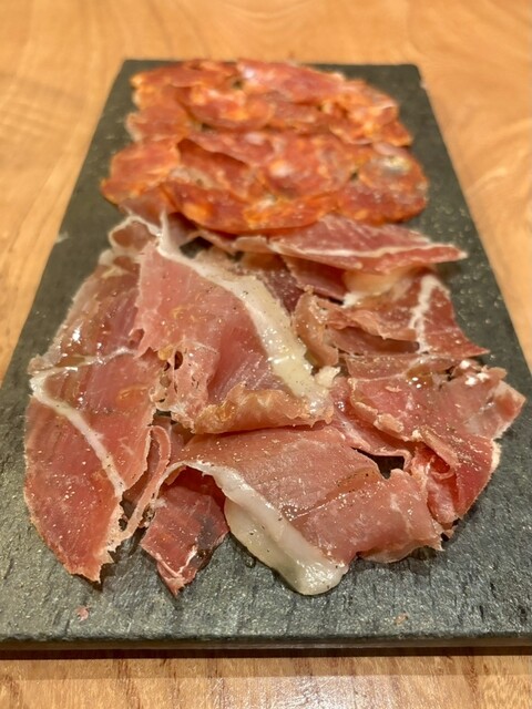 生ハム盛り合わせ、スモークサーモン、地元産野菜のピクルス、リゾットetc