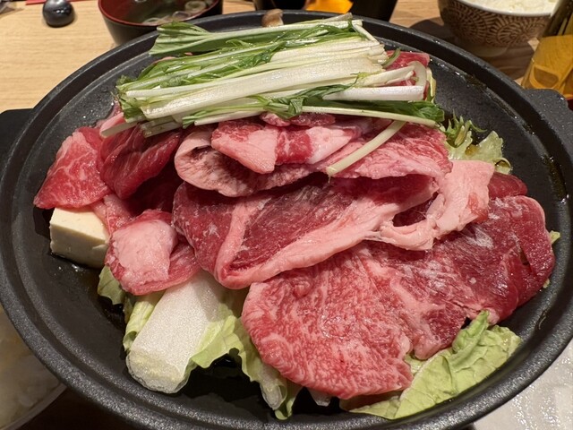 生の状態から自身で加熱して作るスタイルのすき焼き。煮加減もちょうどよく、柔らかい食感の大和牛は最高でした。