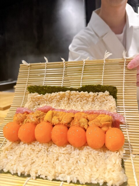 名物(?)の太巻きは、濃厚な卵黄と雲丹がぎっしり詰まった一品。