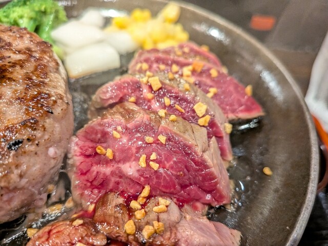 ハラミは表面の裏表をさっと焼き、中はピンクのレア状態で食べると美味しかったです。また、ハンバーグはナイフで6〜8等分に切り分け、1つづつ好みの焼き方にして食べるとよいです。この“とろけるハンバーグ”ですが、何もチーズがとろけるのではなくて、本当にハンバーグがとろけるような食感がたまりません。“ジューシー”という言葉に上位互換の言葉があればそれを使いたいくらいです。