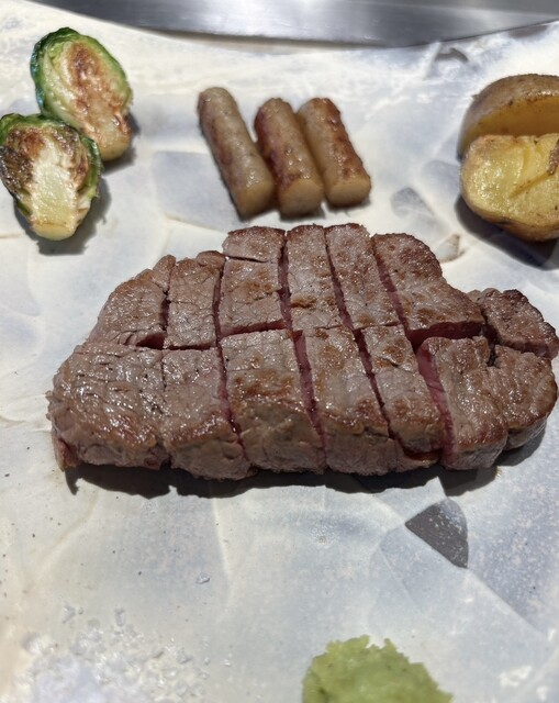 山葵と青森県産にんにくを使った香ばしいガーリックチップが添えられ、お肉と共にいただきます