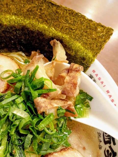 炙りちゃーしゅーらーめん塩、ちゃーしゅー2枚追加、あぶらかすトッピング、麺大盛りを注文しました。