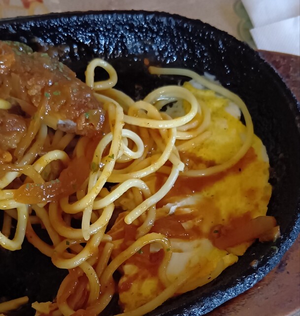 こちらのスパゲティは鉄板に薄焼き卵、その上にパスタなのでわざわざ聞いてくださったんですね。
