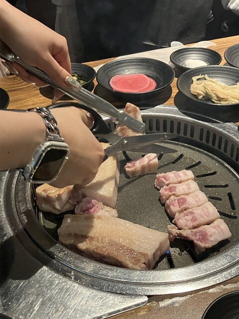 サムギョプサルは塊でドーンと提供、店員さんが焼き、カット全部やってくれるので楽ちんちんです。お肉、本当に美味しい。付属に粗塩、わさび、味噌っぽいタレありますがどれも美味しい。