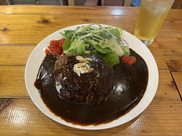 ドンっと乗せられたハンバーグからはスプーンを入れる前から肉汁が溢れてカレーに流れていく。
