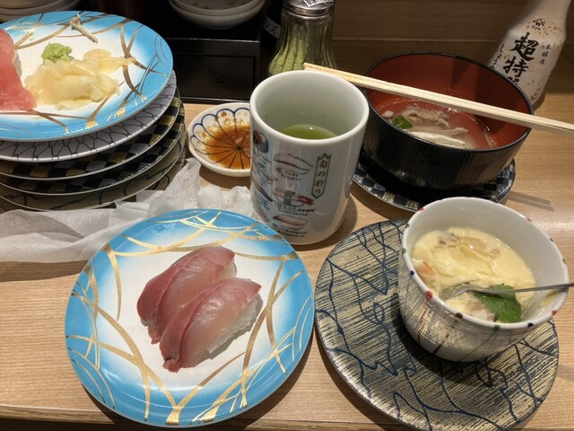 (五郎)おおこれか…あー確かに普通のハマチと全然違うトロだ…看板に偽りなし…いいじゃないか☺️ここでうしお汁を挟んで…ハアハア締めだ…トロハマチにして大正解すごく美味しい回転寿司もいいもんだ…思いもよらない色んなネタが飛び出してくるし…楽しいメシが食えた楽しみすぎだろ…ごちそうさまでした