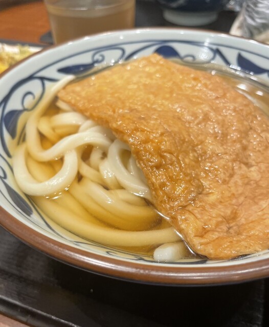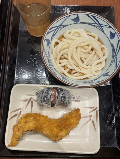 きつねうどん、ちくわ磯辺揚げ、さつまいも天ぷら、明太おにぎり