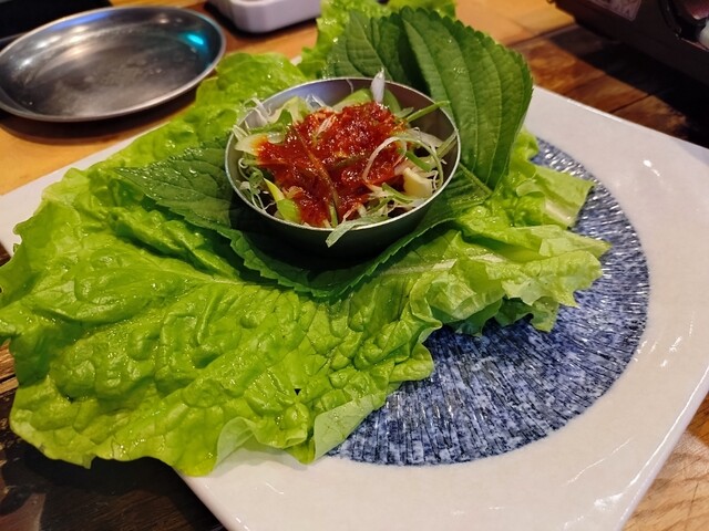 えごまの葉、にんにくごま油、キムチ、パチョレギがセットで付きます。