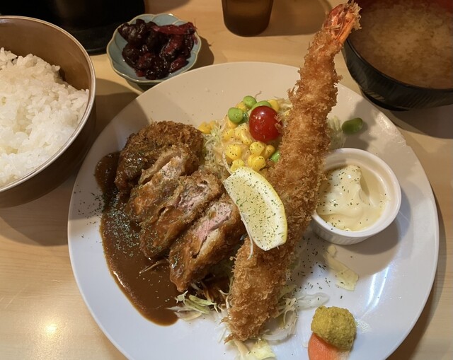 ヒレカツ2こ(を半分に切って4個にしてある)&エビフライを注文。デミグラスソースとマスタードを添えたヒレカツが驚くほど柔らかい。大きなエビフライもプリッとした食感です。ご飯も味噌汁もしば漬けもたっぷりして太っ腹、これで1100円。都心なら1700円は取るでしょうね。