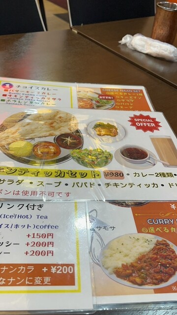 • チキンティッカセット(980円):2種類の選べるカレーに、香ばしく焼かれたチキンティッカ、ナン、ライス、サラダ、スープ、さらにパパドやドリンクまで付いた超豪華セット。^_^