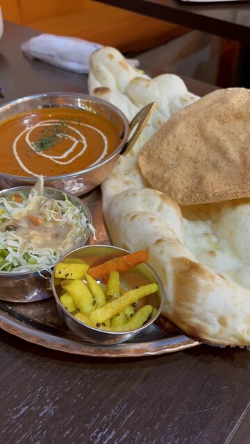 バターキーマやチキンティッカマサラなど、選べるカレーはどれもスパイスのコクが深く、焼きたての巨大なナンと一緒にいただけば、お腹も心も満たされます。