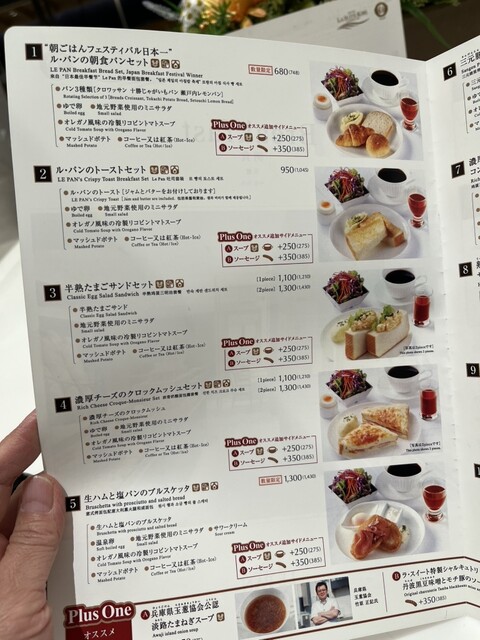 • モーニングセット(748円): 丁寧に焼き上げられた数種類のパン、フレッシュなサラダ、ゆで卵、そしてトマトジュースとコーヒーがセットになった、非常にバランスの良い朝食です。