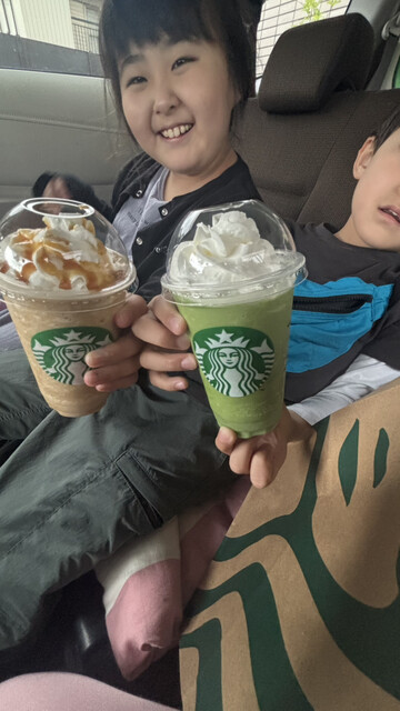 ところが、ギフトだけ買って帰る予定が、子どもたちが「ドリンク飲みたい!」とスタバモードにスイッチ。せっかくなので、キャラメルフラペチーノ(ショートサイズ)と、抹茶フラペチーノ(ショートサイズ)を注文。