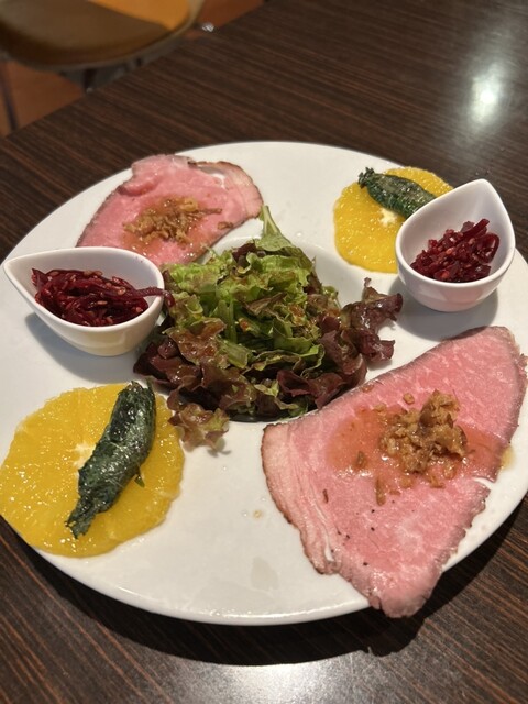 続く8種のアンティパストは一皿一皿が丁寧で、バリエーションも豊富。本マグロの中トロにぎりはなめらかな口当たりが印象的。フォアグラのソテーはコクがあり、バルサミコ酢との相性も良かったです。ローストビーフのカルパッチョや揚げナスのそぼろチーズなど、それぞれ違った味わいが楽しめました。