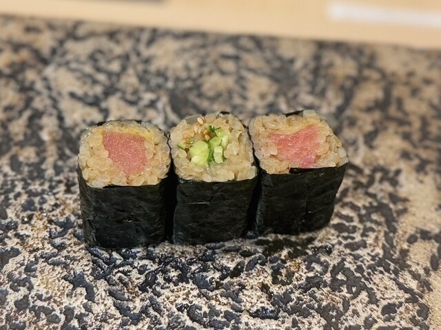 中トロのたたきとたくあんでおはぎに見立てた一貫。
