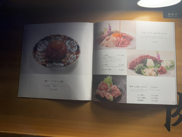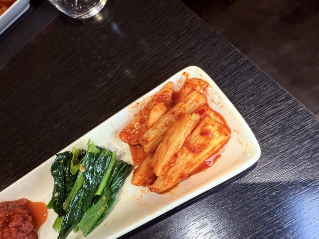 ○自家製キムチとナムルの盛り合わせ 白菜キムチ、長芋キムチ、生酢、ほうれん草ナムル、そして…なぜか極ユッケ。 キムチはどれも主張しすぎず、食前にちょうどいい塩梅。で、このユッケ。さらっと入ってるけど、肉の質が良すぎて普通に主役級。いきなりテンション上がる。