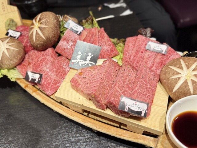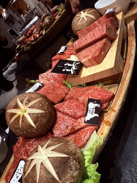 ○山形牛船盛りと新潟県魚沼産 八色しいたけ この日のおすすめ部位を舟盛りで。 シャトーブリアン、サーロイン、ウチモモ、カイノミ、イチボ。 シャトーブリアンは箸でも切れてしまうレベルの柔らかさ。どの肉も噛めば噛むほど、上質な肉の旨みがジュワジュワ溢れる。 八色しいたけも肉厚で、ここにバター醤油を垂らした瞬間…もう最強。