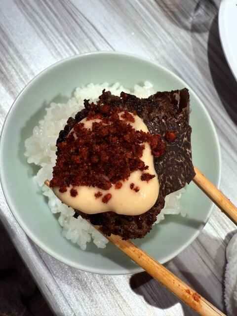 まずハンバーグ、箸を入れた瞬間にふわっ…ジュワッ…。和牛の旨みがぎゅっと詰まってて、噛むたびに肉汁が溢れ出す。そこにフォアグラのコクが合流して、トリュフの香りがふわ〜っと鼻を抜ける。 これはもう、夜に食べる罪深さ込みで完成してる味。