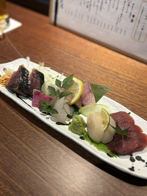 まずはやっぱり刺身盛り合わせ。5種もあり、かつお・ほたて・まぐろなど万人受けの内容。想像以上の豪華さだし、鮮度が良い!ぜひ頼んでみてください!