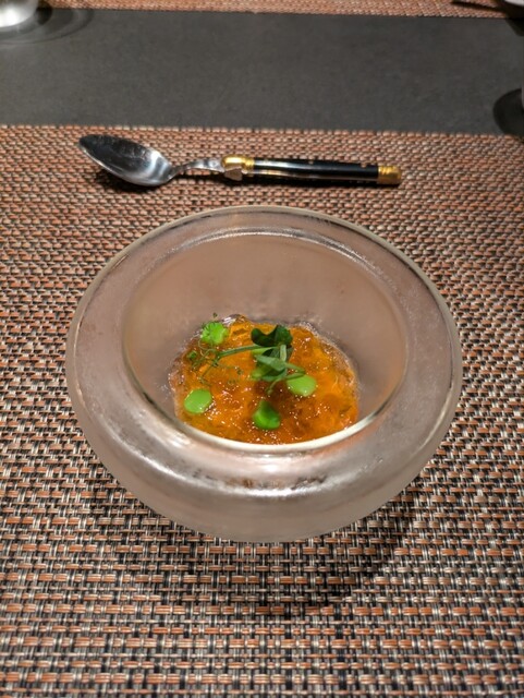 熊本・天草の車海老、富山・氷見の甘海老、同じく富山湾の白海老を使った一皿。キャビアの乗った車海老の中に、生の甘海老が入っており、見た目も食感も華やかで楽しい。車海老はぷりぷり、甘海老はとろけるように甘く、白エビは香ばしく、それぞれ異なる海老の味わいを楽しめる。