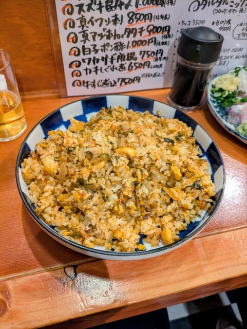 お通しから刺盛り、定番のポテサラ、焼売、そして高菜チャーハン…どれも美味しく頂きました