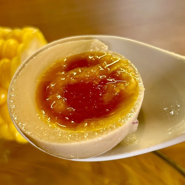 濃厚な黄身の旨味を引き立てた味付けと絶妙な半熟加減で粘性のあるトロトロ食感を楽しませてくれる味玉