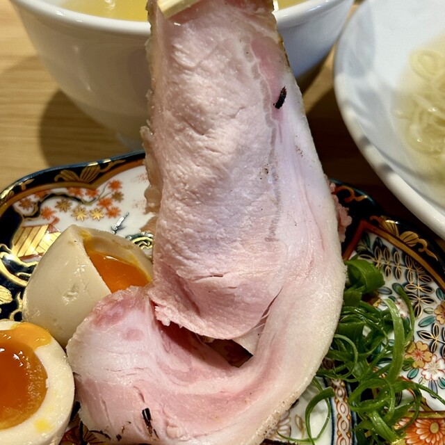 つけダレの完成度が高いだけでなく、トッピングの完成度も高く香ばしい味わいの肩ロースにしっとり食感で鶏白湯と相性がいいローストポークはよりつけ麺に華を添えてくれました