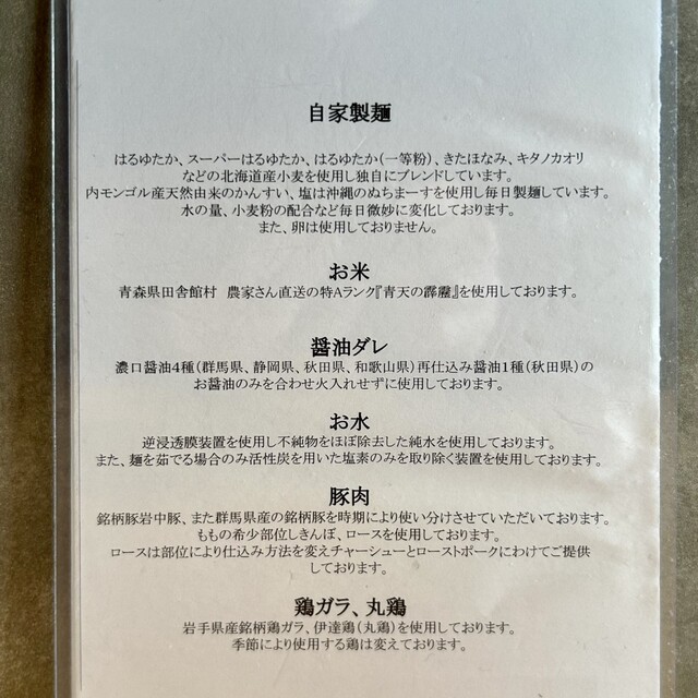 麺は自家製麺でスーパーはるゆたか、はるゆたか(一等粉)、きたほなみ、キタノカオリなどをブランドした自家製の中細ストレート麺です