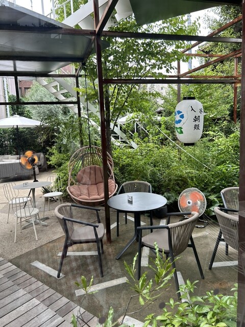 階段上がって外のテラスでもゆっくりできるし、お外のスペースはわんちゃんも入れるのでわんちゃんも見られたり癒しがたくさん❣️今時期は冷たい霧も出ていて涼しく過ごせる工夫も有難いっ