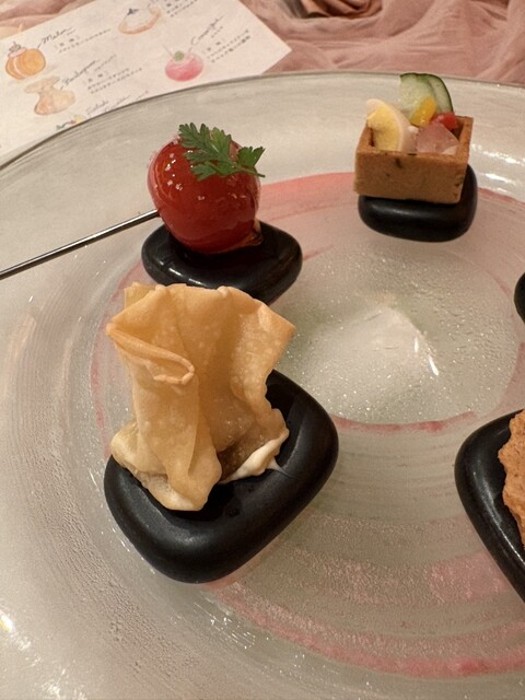 ラ・プロヴァンスの代名詞とも言えるスペシャリテ。南仏を思わせる色彩豊かな5つの味覚(旨・苦・塩・酸・甘)が並びます。特に「トマトのキャラメリゼ」は、カマルグ塩が素材の甘みを極限まで引き立て、噛んだ瞬間に果汁が溢れる驚きの一皿。
