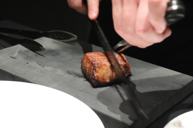 冒頭からライブ感満載の演出に圧倒されます。田村牛の濃厚な旨みと甘みがダイレクトに伝わる逸品。