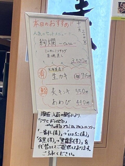 ボイル海老(¥110×3)、白子ポン酢(季節商品・¥880)、
