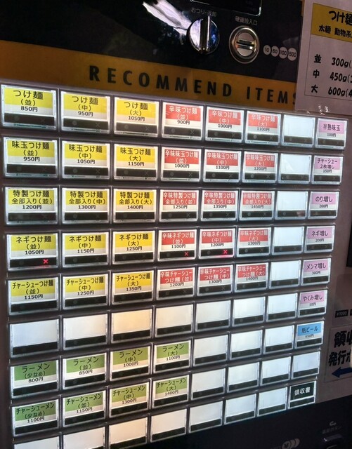 麺量は全体的に多めで、つけ麺は並300gから、ラーメンは小150g(1玉)〜大600g(4玉)まで、150g(1玉)刻みで選べます。