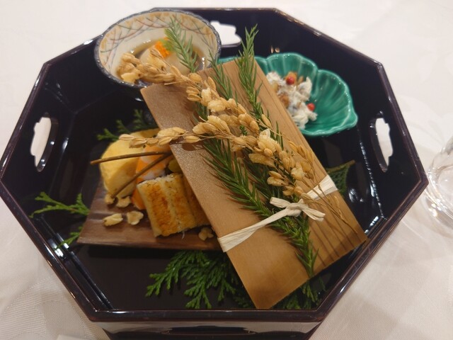 胡麻豆腐、木野子白和え、鰻白焼き、出し巻き、有頭海老、小芋衣かつぎ、人参きんぴら、たたみいわし、揚銀杏