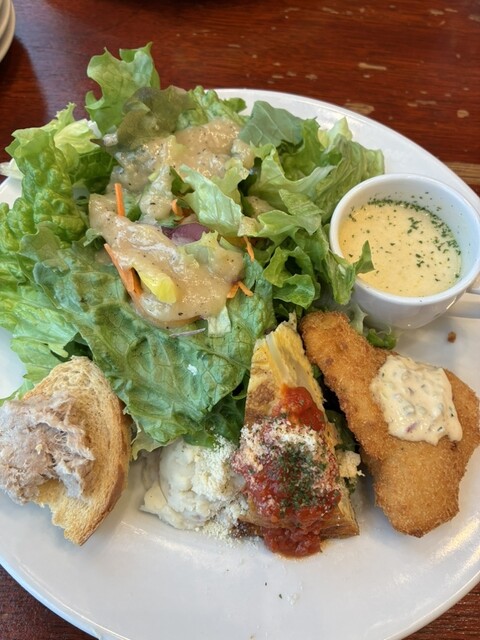 量が多いのですがメインにドリンク、デザートをつける値段で豪華な前菜がつくのでついセットを注文してしまいます。選んだパスタは三郷ミートソース。たっぷりの挽肉にちょっと違ったタイプの肉も入ってて肉を食べている感じがします。
