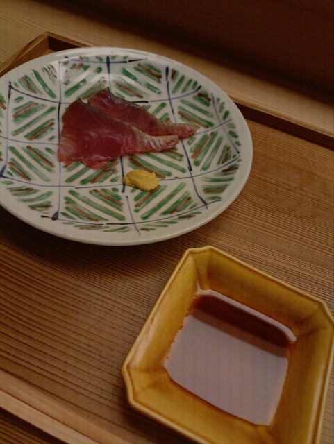 カツオの刺し身をからしでいただく。