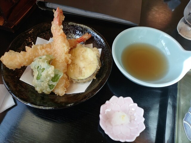 刺し身盛り合わせ、天ぷら盛り合わせ、焼き魚、茶碗蒸し、煮物、お新香、ごはん、お味噌汁。