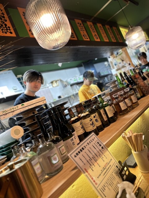 焼酎がグラスに入っており、瓶のコダマを自分で注ぐスタイル