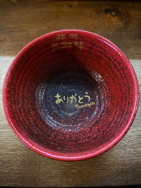 どんぶりも厚手の高級感あふれる器です。「三鈷峰」のロゴも入っておりお洒落などんぶりです。炎の陶芸家が作った抹茶茶碗が出てきたかと思いました。そして、スープを最後まで飲み干すと「ありがとう」の文字が現れます。粋な計らいありがとうございます…このどんぶりの「ありがとう」がこのお店すべてを語っているかのようです。
