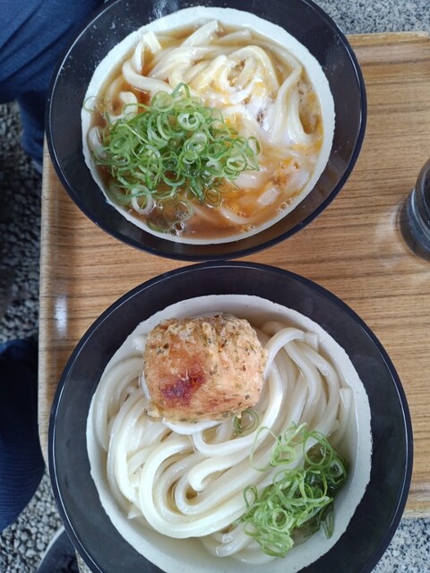 連れは、王道の「かまたま(350円)」を頼んで、ジャガイモの天ぷらとちくわの天ぷらも取っていた。天ぷらは、どちらも150円。